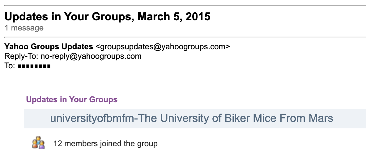 I am suddenly getting daily automated email updates from a decade-old Yahoo! group called “The University of Biker Mice from Mars”.